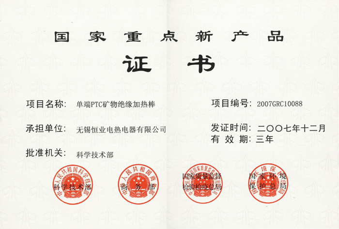 上一篇: 單端PTC礦物絕緣加熱棒高新技術產(chǎn)品認定證書