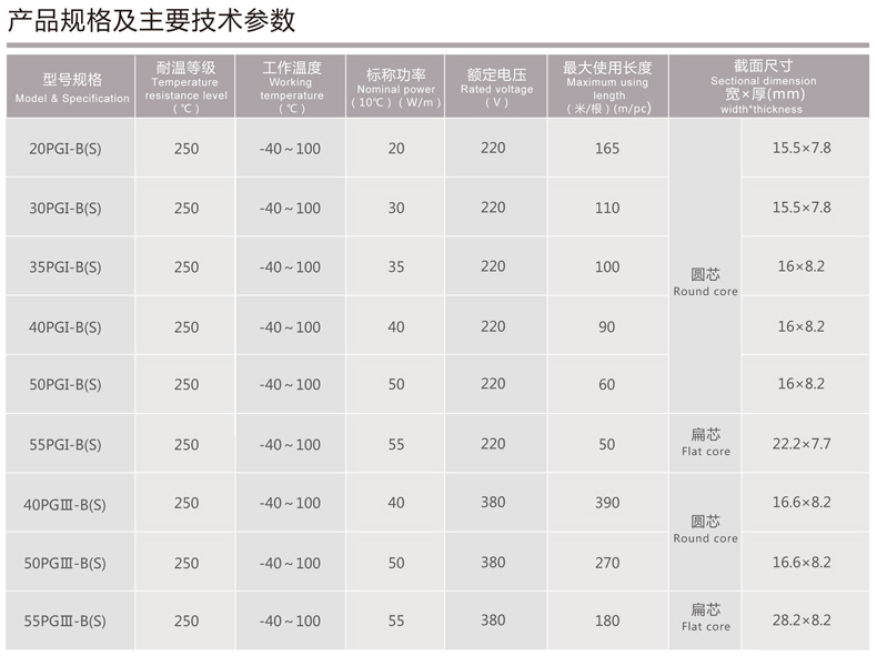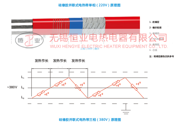 硅橡膠并聯(lián)式電熱帶的電源母線為二根或三根平行絕緣銅絞線, 在硅橡膠骨架層上纏繞P T C合金絲, 并將PTC合金電熱絲每隔一定距離相間交叉即“發(fā)熱節(jié)長"與母線連接,形成連續(xù)并聯(lián)電阻,母線通電后,各并聯(lián)電阻發(fā)熱,因而形成一條連續(xù)的電熱帶。硅橡膠并聯(lián)式電熱帶每米有一定標稱功率,使用的電熱帶越長,輸出的總功率越大,但由于采用PTC合金絲作為發(fā)熱元件,因此,其本身具有隨溫度變化而調節(jié)輸出功率的特性,且電熱帶采用硅橡膠作為絕緣材料,因此,帶體柔軟,便于安裝。該電熱帶在現(xiàn)場能按實際需要長度任意剪切。